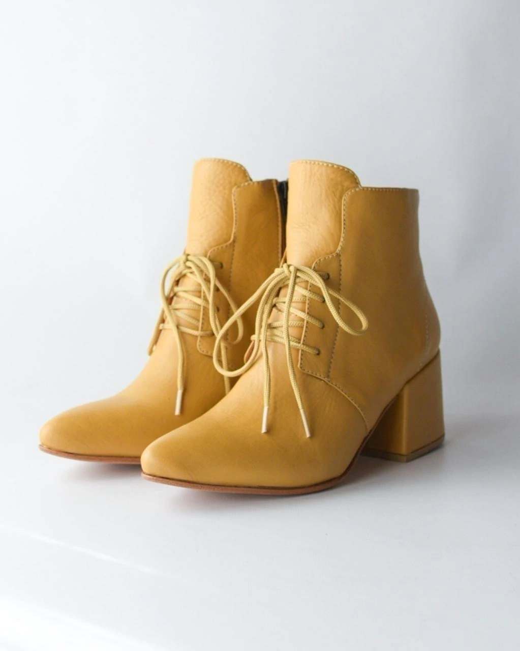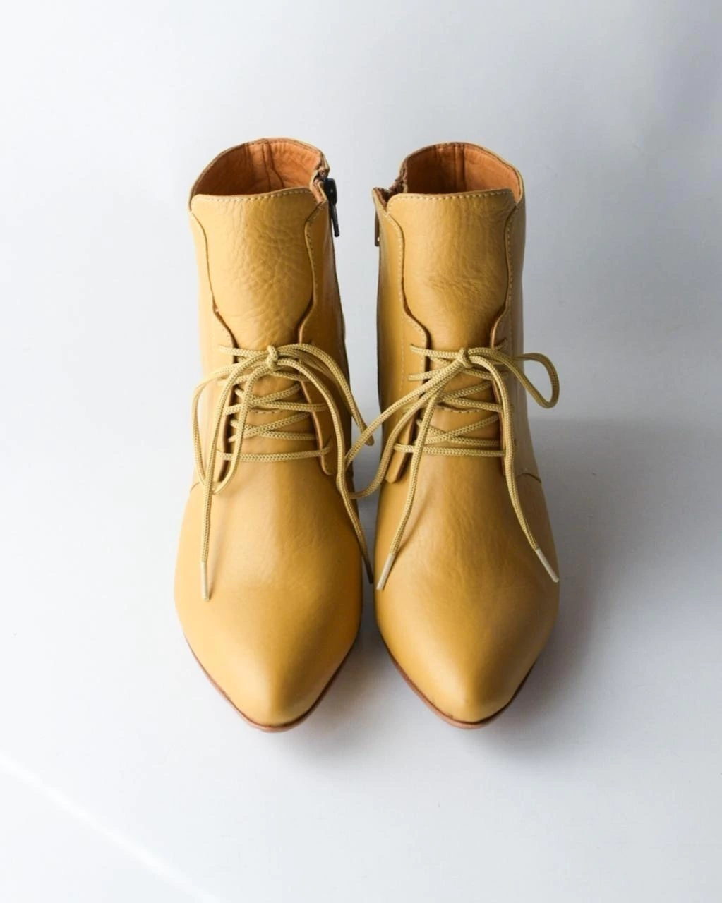 Estas botas cortas al tobillo, con su caña de 18cm de alto, están confeccionadas en cuero napón color maíz.
