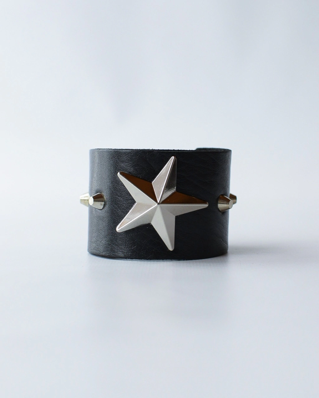 Brazalete ancho de cuero negro con dos apliques diferentes: estrella o León.