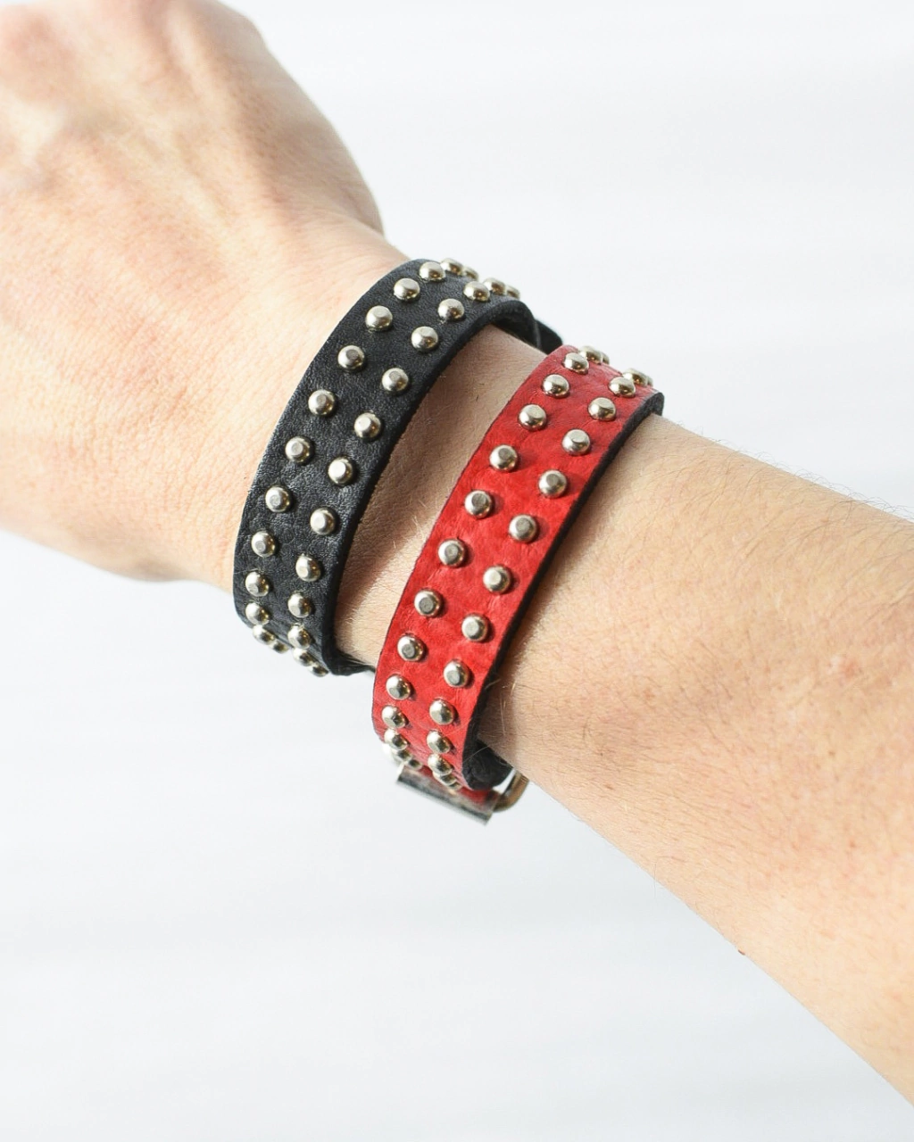 Brazalete cuero con tachas regulable en 2 posiciones, forrado en su cara interna con cuero.
