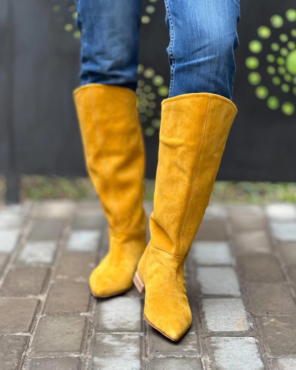Descubrí la sofisticación de las Bucaneras Pía, confeccionadas en 100% cuero gamuzón color mostaza, un tono vibrante que aporta un toque único y moderno. Su caña alta, que llega hasta la rodilla, está diseñada para pantorrillas de hasta 44 cm, garantizando comodidad y ajuste perfecto.