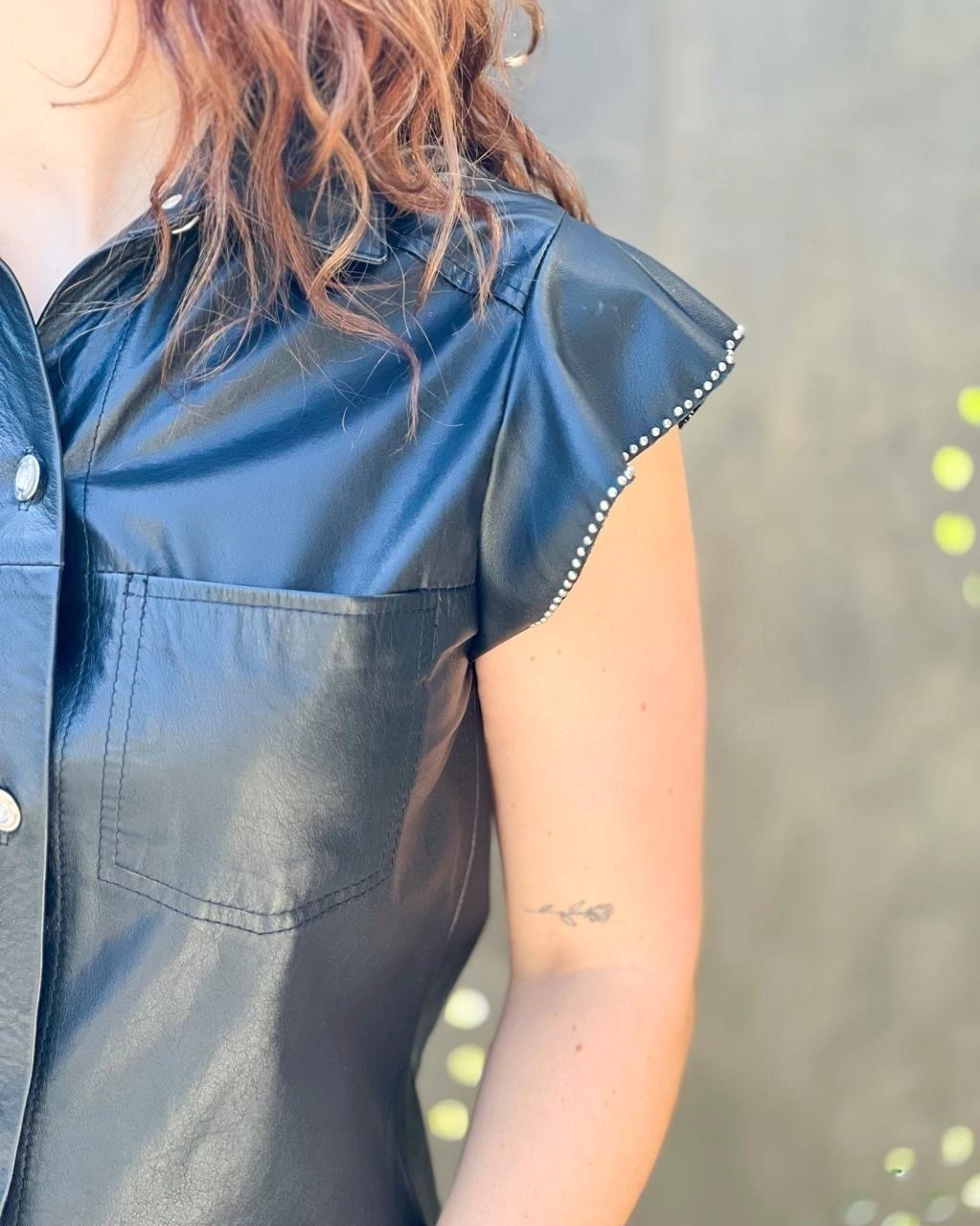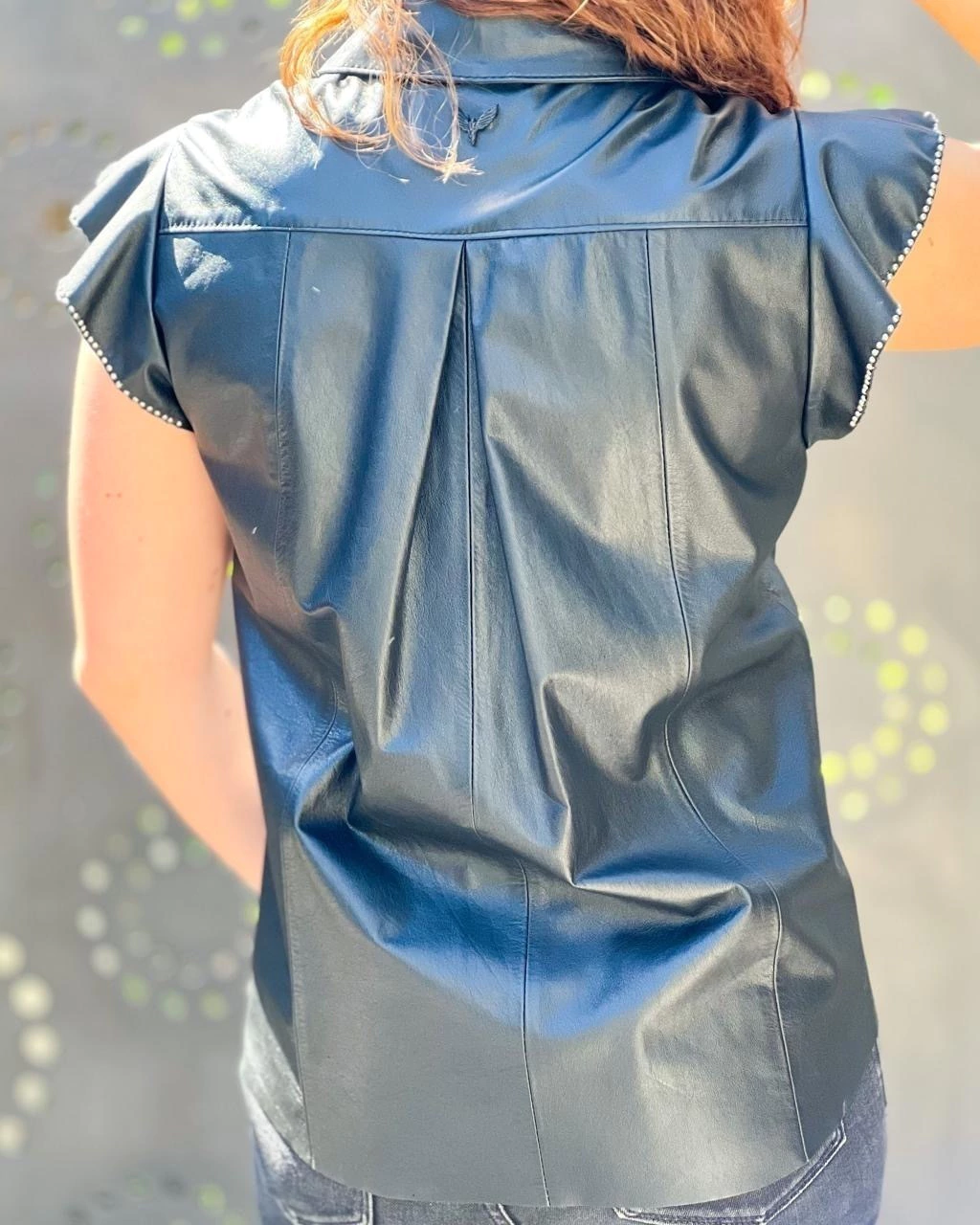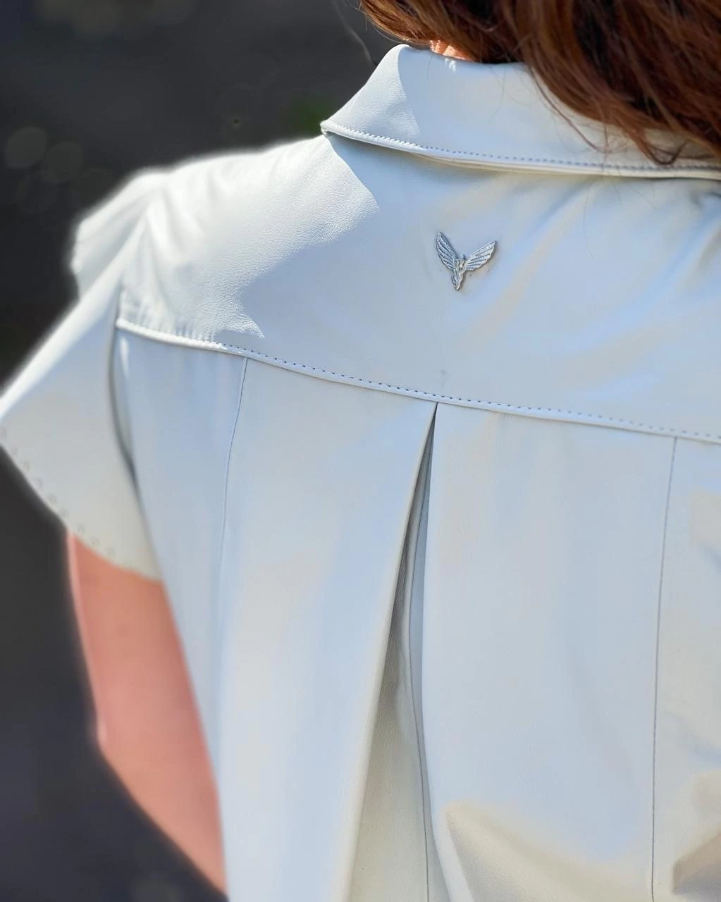 Descubrí la sofisticación de esta camisa de manga corta, confeccionada en 100% cuero vacuno de espesor liviano y ligero, que garantiza confort sin sacrificar estilo. Su diseño exclusivo incluye un recorte a la altura de los hombros con efecto manga corta murciélago, acentuado con microtachas que realzan su elegancia única.