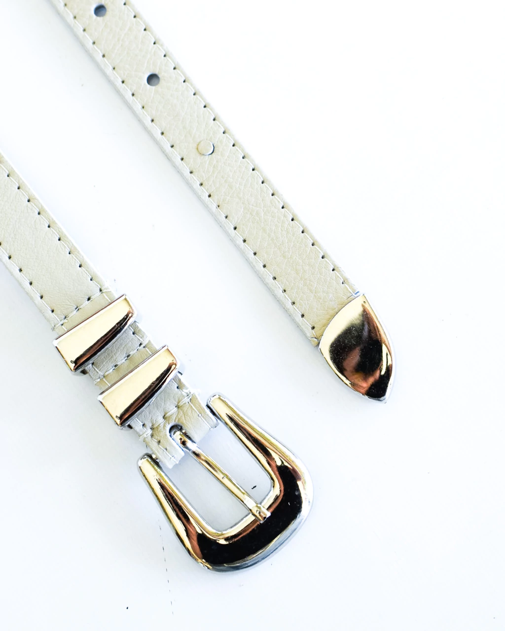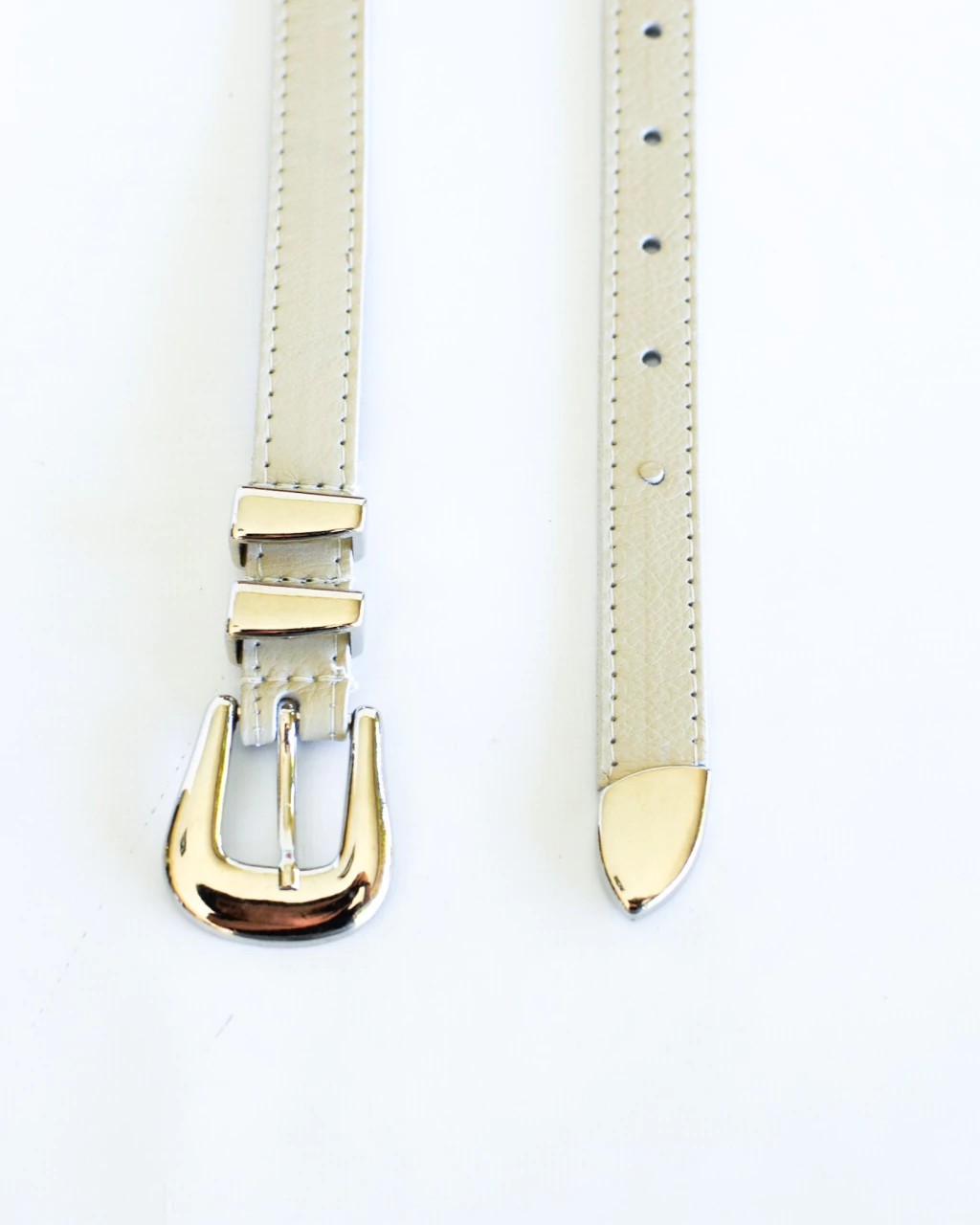Descubrí este cinturón confeccionado en cuero vacuno color off white, con una delicada hebilla texana lisa, dos pasadores y una puntera chanfleada en níquel pesado que realzan su estilo sofisticado.