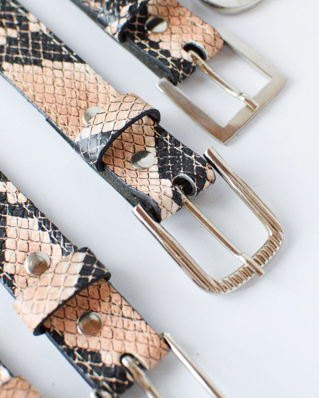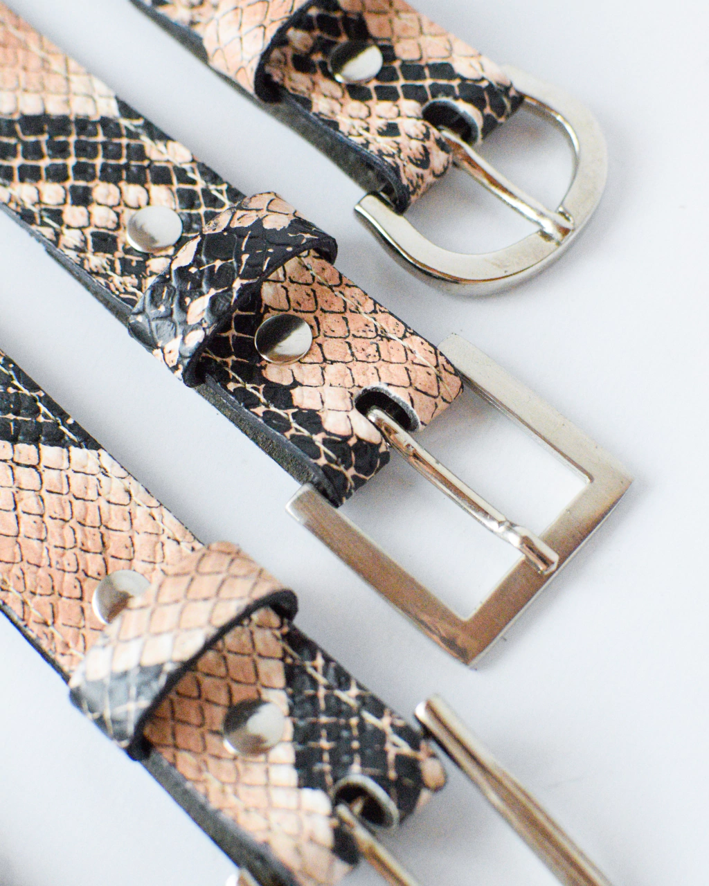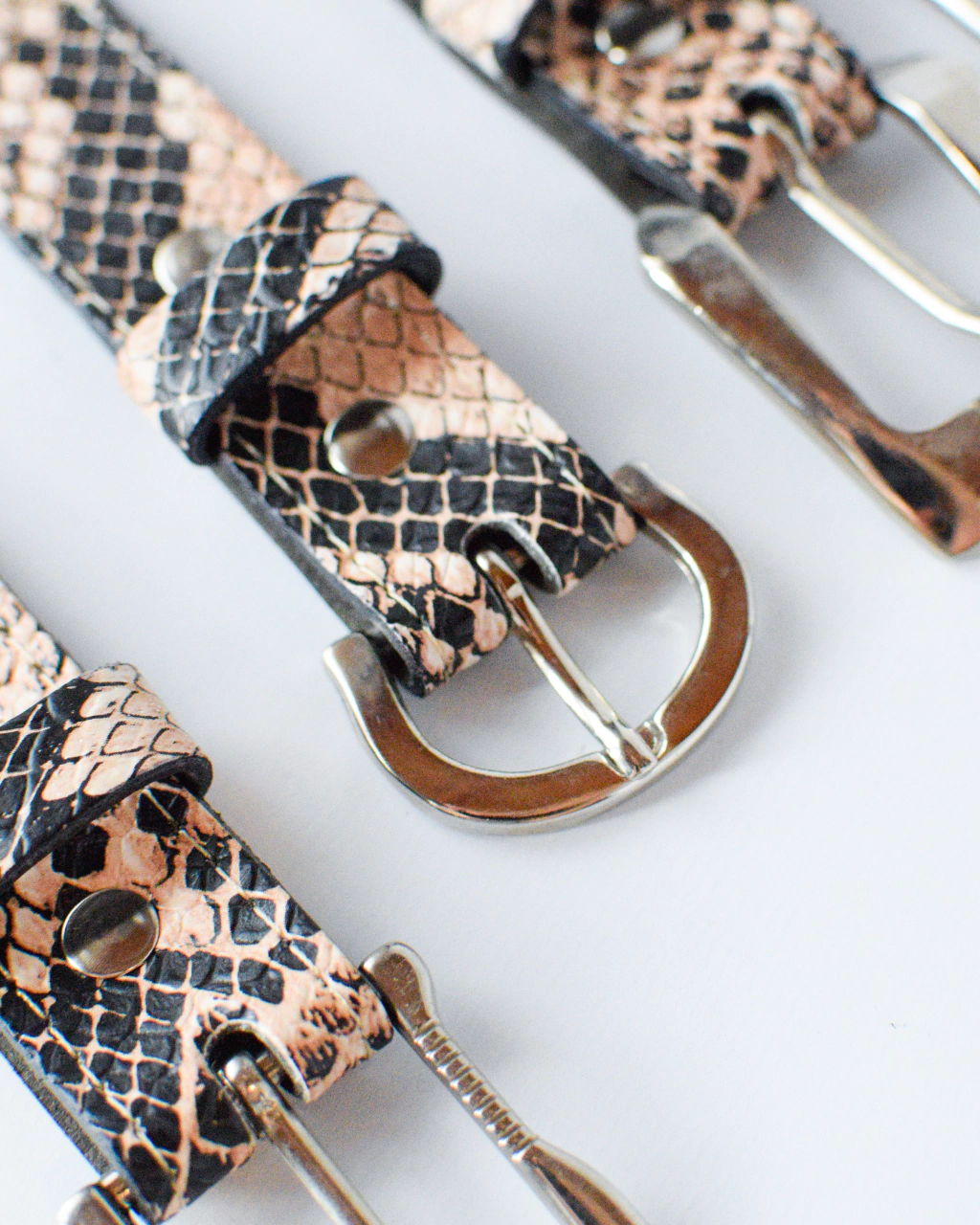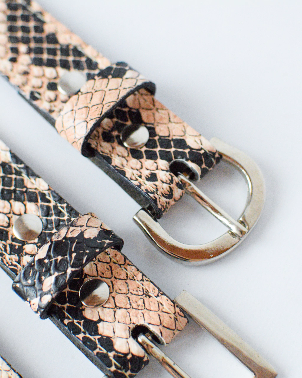 Cinturón confeccionado en 100% cuero tipo reptil en tonalidades rosas y negras.
