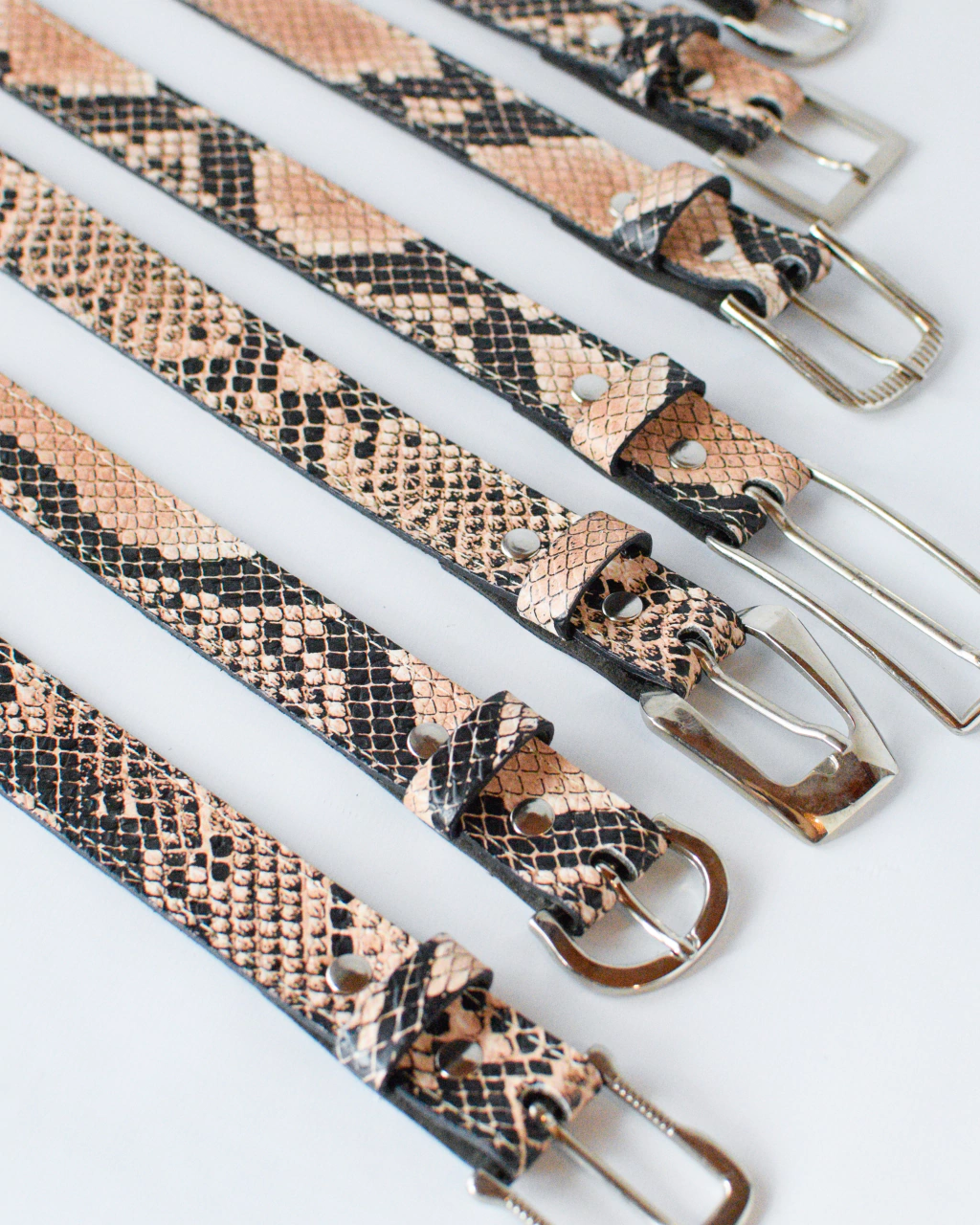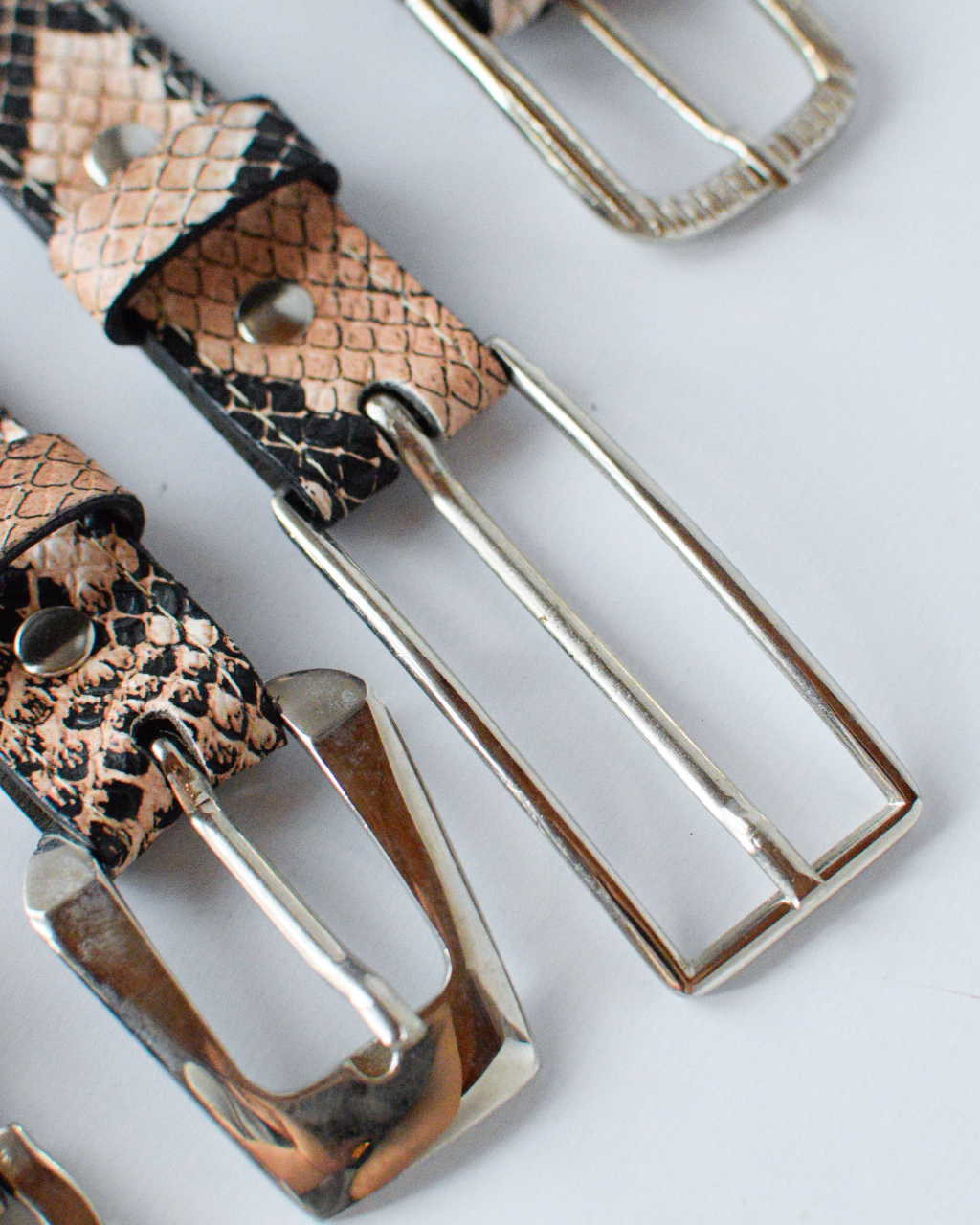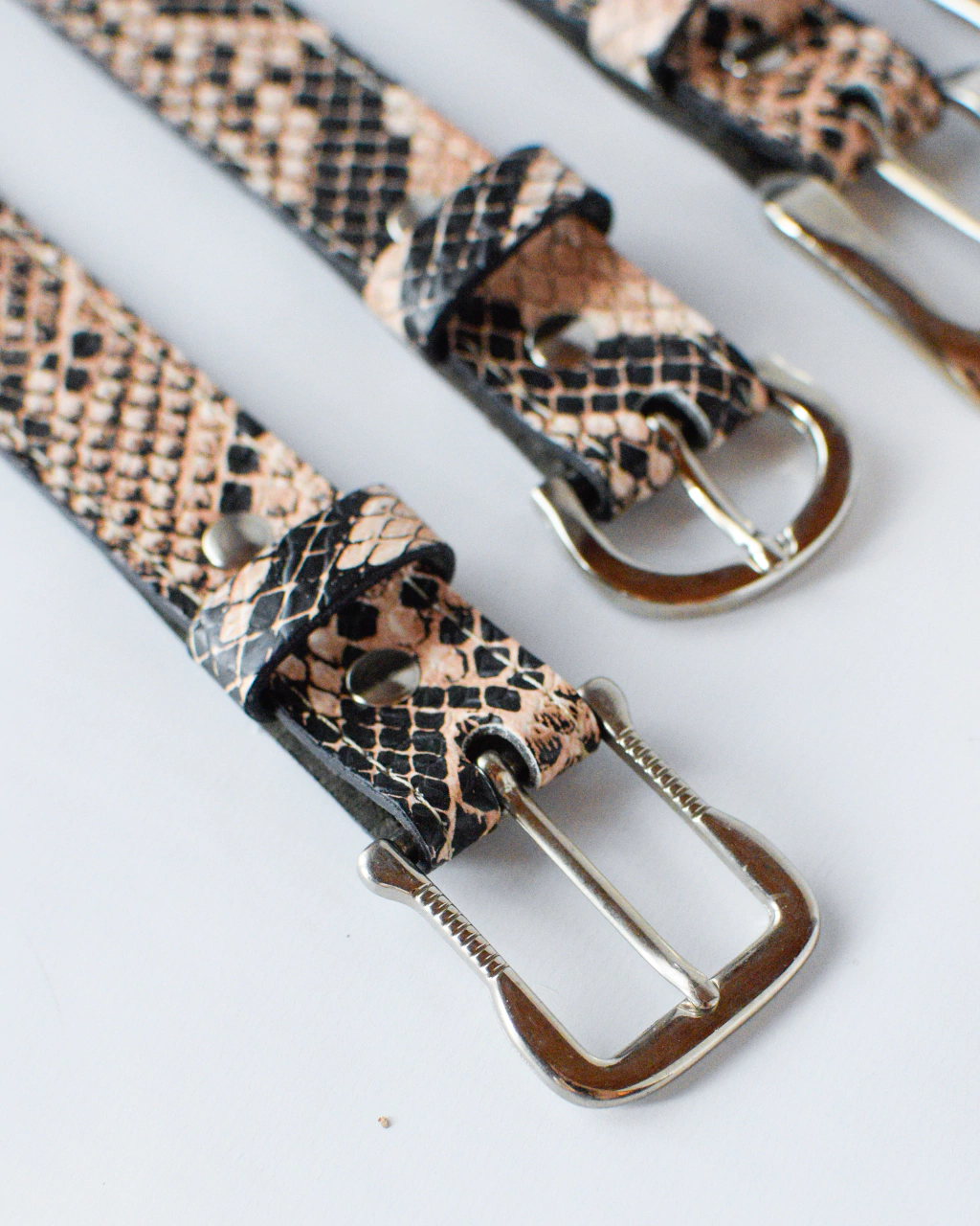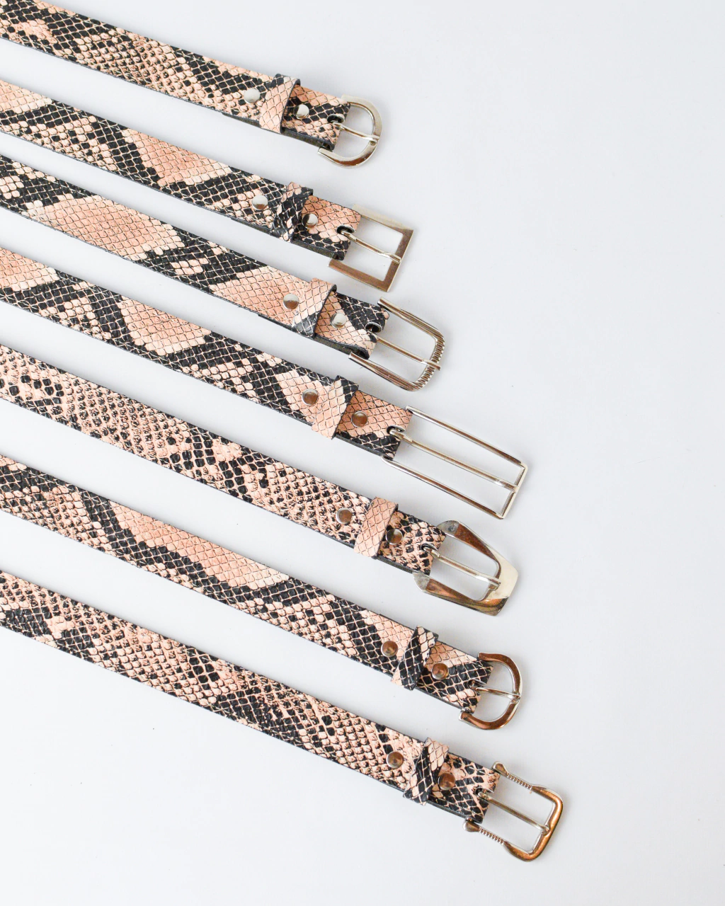 Cinturón confeccionado en 100% cuero tipo reptil en tonalidades rosas y negras.