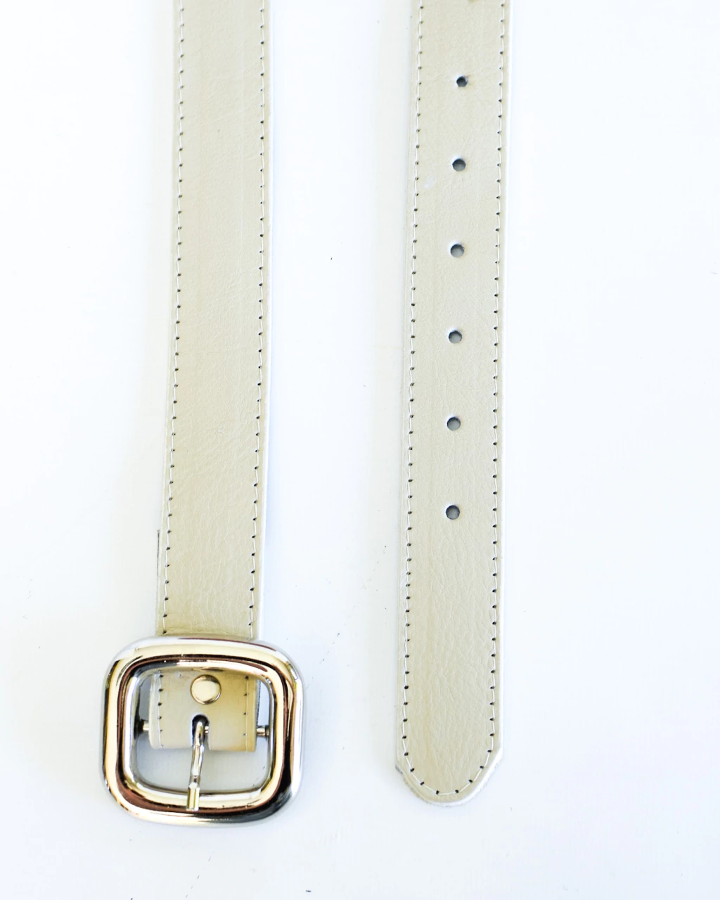 CINTURÓN MEME: sofisticación en cada detalle. Este cinturón está confeccionado en 100% cuero vacuno color off white, que aporta un estilo puro y elegante. Su hebilla ancha cuadrada con bordes redondeados realza su diseño distintivo.