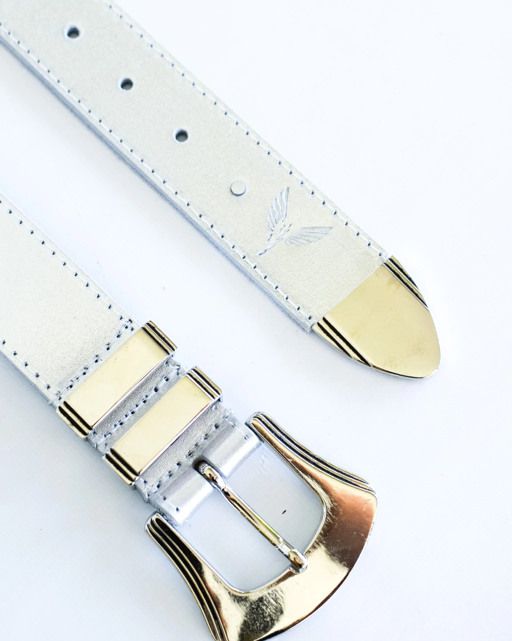 Confeccionado en 100% cuero vacuno color plata, este cinturón destaca por su doble pasador y hebilla texana de níquel pesado con finos detalles que realzan su sofisticación.