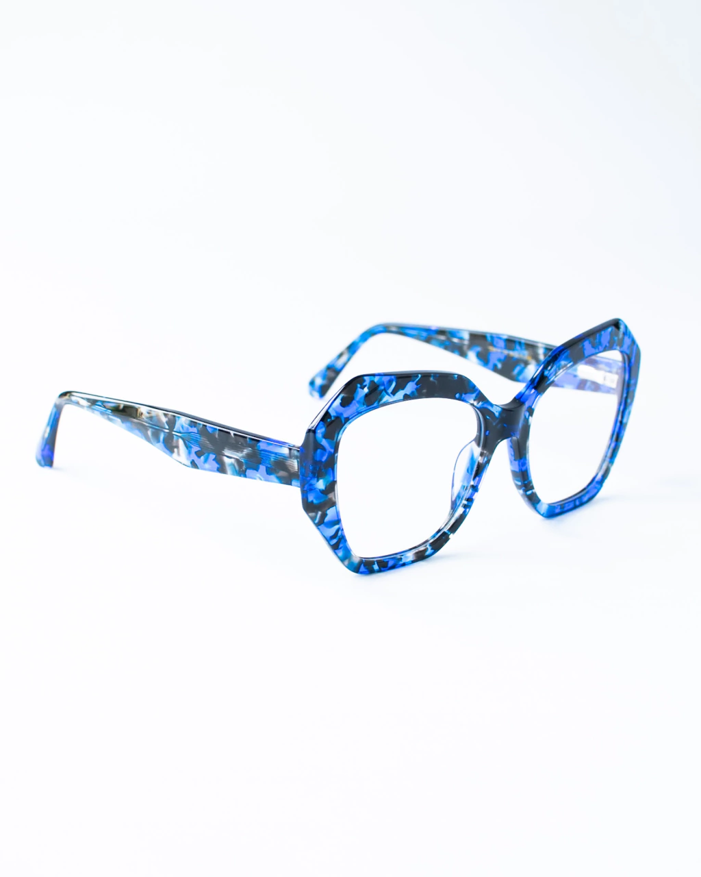 Marco de lentes de forma hexagonal confeccionado en acetato de distintos tonos y colores.