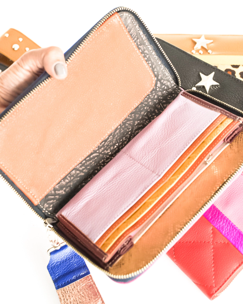 Posee espacio para 12 tarjetas, un monedero, lugar para billetes y espacio para celular. Además, tiene manija con mosquetón y tachas decorativas para mejor agarre.