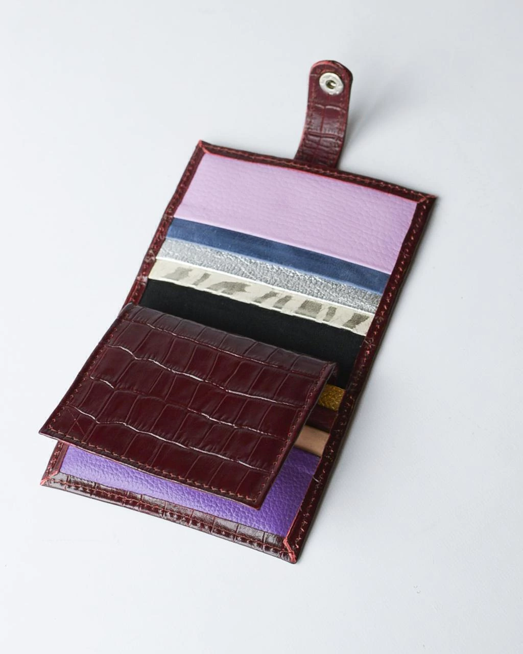 Tarjetero doble confeccionado en distintos cueros de colores.