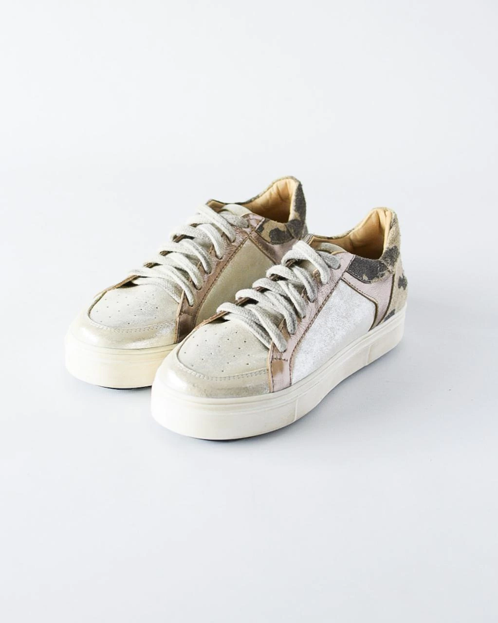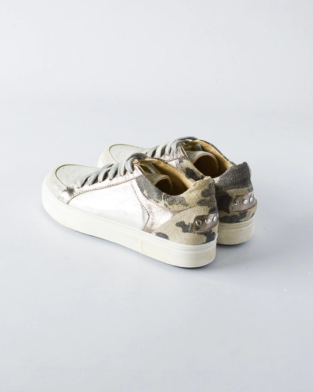 Este modelo destaca por su base de goma antideslizante con detalles de desgaste, que asegura comodidad y seguridad en cada paso. La coordonera y el talón en cuero color peltre, combinados con cuero gamuzón de diseño camuflado y microtachas en el talón, aportan un toque moderno y exclusivo.